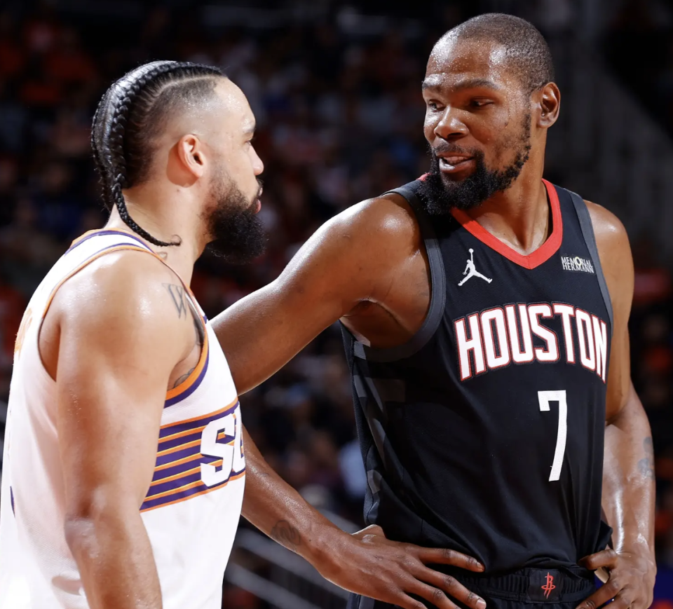 但是火箭想抢字母哥,也抢不过马刺雷霆这些球队,杜兰特又是给点身体对抗就不行了,那还不如把他送回太阳。现在KD是没有办法掌握自己交易的主动权的,因为他已经和火箭续约了,想把他送哪去就送哪去,因此能把他送回太阳,换回狄龙和格林,火箭就还有机会。